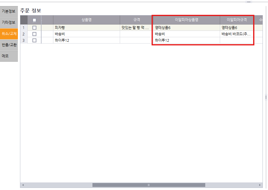 CRM관리 Ver.3 취소/교체 , 반품/교환탭에 이알피아상품명, 이알피아규격 컬럼 추가