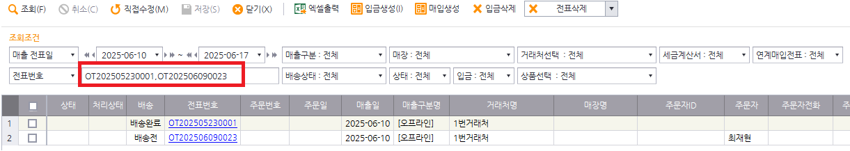 검색 조건이 전표번호or 주문번호일 경우, ","로 구분하여 여러개의 전표번호나 주문번호를 입력해주시면 전표 다중 조회가 가능합니다.