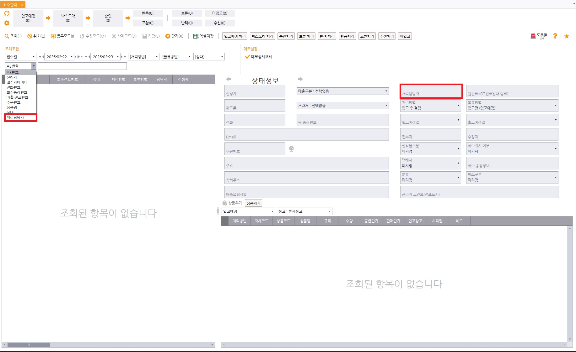 검색조건에 처리담당자가를 검색할 수 있도록 기능 추가