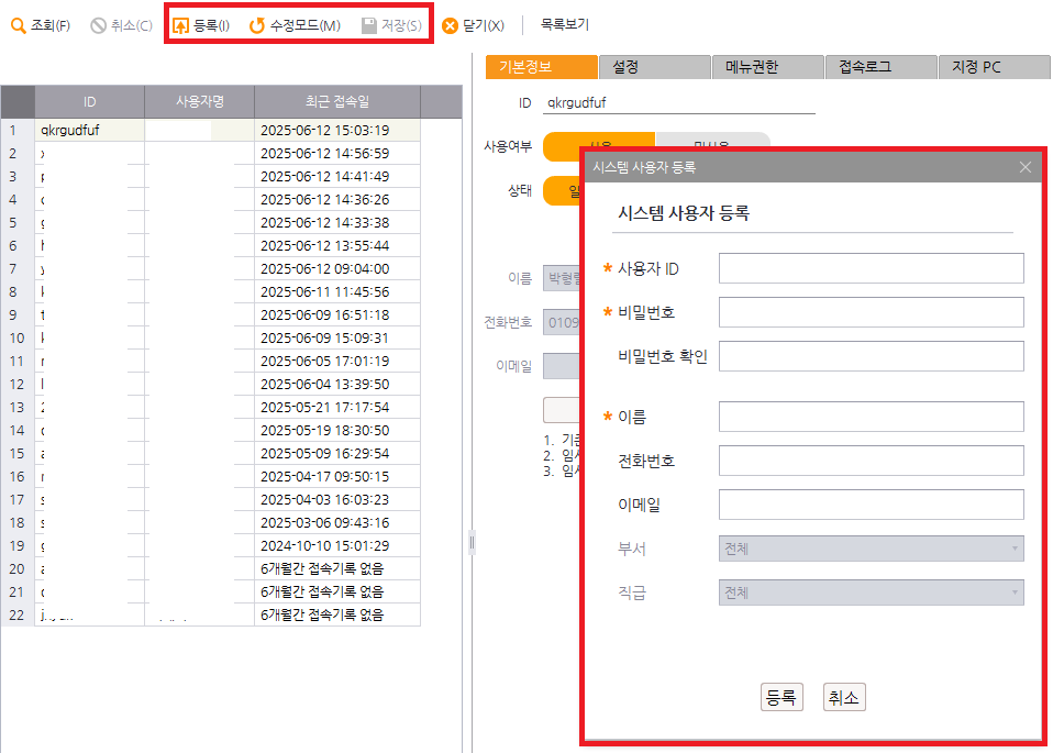 등록 버튼 클릭 시 신규 사용자 생성 화면이 노출됩니다. 해당 화면에서 필수정보들을 입력하고 저장하시면, 새로운 사용자 아이디가 추가됩니다.