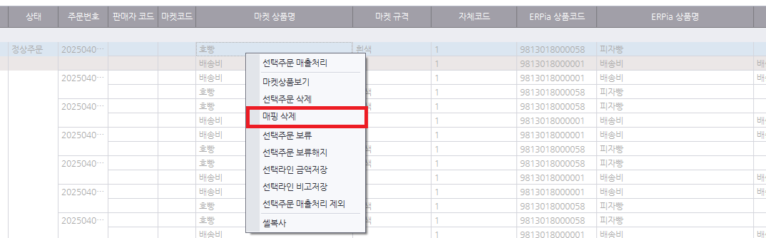 클릭 시 해당 주문은 다시 검은색으로 복구되어 재매핑이 가능합니다.
