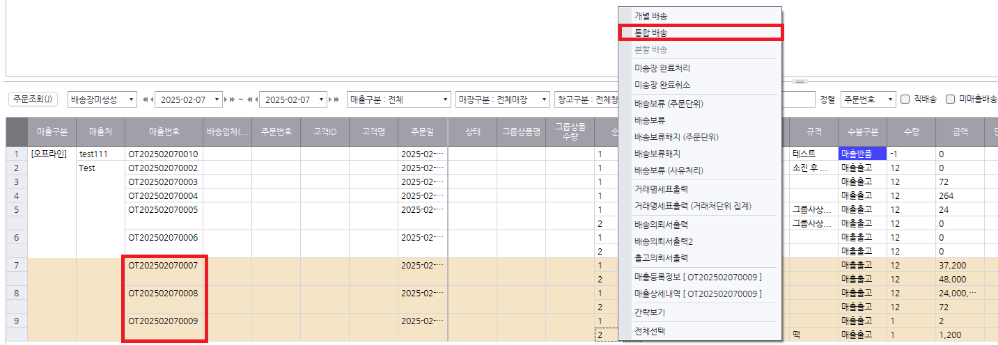 A.물류관리 상단에서 등록 버튼을 누른 상태에서 물류관리 하단에서 합포장할 주문을 드래그한 뒤, 마우스 우클릭🖱️> [통합배송]을 선택합니다.